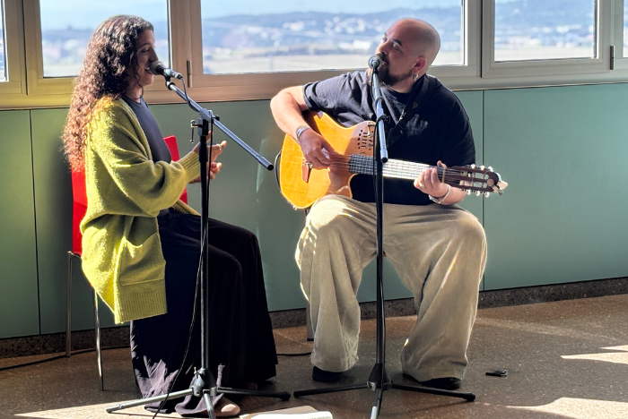 Esta mañana el vestíbulo de la planta de cuidados paliativos del Hospital Universitario de Terrassa ha acogido una actuación musical de Afra y Daniel Felices, miembros de Pal·li-Aktius e integrantes del proyecto musical ‘Soroche’. La actividad se ha enmarcado en el Plan de Humanización del CST, uno de los ejes del Plan Estratégico 2025-28, y ha tenido como objetivo acercar la música, el arte y la cultura al hospital para favorecer espacios de bienestar para pacientes, familias y profesionales.